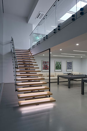 The site for this waterfront residence is located on the Great Neck Peninsula, facing west to views of NYC and the borough bridges. Due to strict height requirements the house from the street appears to be one story and then steps down the hill allowing for three fully occupiable floors. The configuration of the home is a U-shape surrounding a rear courtyard. This shape, along with suspended pods assures water views to all occupants while not compromising privacy from the adjacent homes.