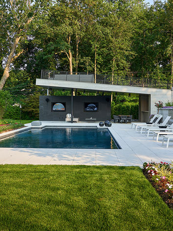 The inside portion of the cabana has a lounge tv area, bath/changing room and a bar that services the covered outdoor seating. Along with this, there is also a storage room for all the pool accessories and in the winter, the outdoor furniture. The covered portion is framed by a free-floating wall which houses outdoor tv’s and serves to block the view to a neighboring property, and therefore, creates secluded setting. Heaters are set in the ceiling to extend the use of the space beyond the summer season.
