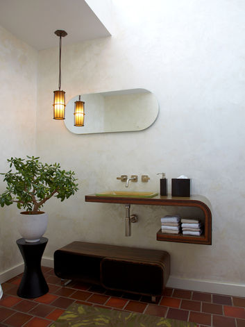 The interior of the home maintains the basic white paint palette, but to soften the impact new storage areas and millwork are fabricated out medium toned mahogany. Other than the living rooms wood floor that was refinished the balance of the homes public space floors were covered in a terracotta title, the original manufacture of this tile was found; this allowed us to seamlessly integrate the new floor areas into the original.